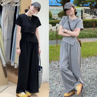 Korean Vintage Style Women's Summer Set Simple and Irregular Short Sleeve T-Shirt with Wide Casual Pants Two Piece Set