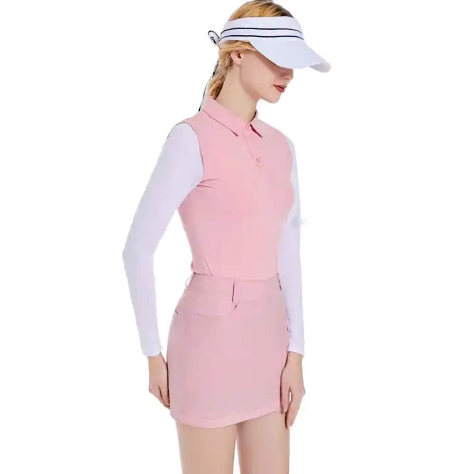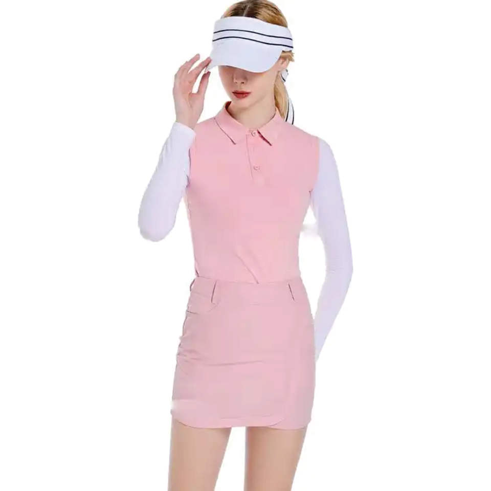 เสื้อกอล์ฟแขนยาวผู้หญิงเกาหลีเสื้อยืดเข้ารูประบายอากาศได้มีซิปเสื้อโปโลกระโปรงซับในชุดเล่นกีฬา