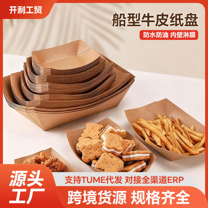 กล่องกระดาษคราฟท์ทรงเรือ กล่องอาหารแบบใช้แล้วทิ้ง รูปทรงสี่เหลี่ยมผืนผ้า ย่อยสลายได้ ป้องกันคราบไขมัน เกรดสำหรับอาหาร กล่องใส่ของกลับบ้าน กล่องขนม