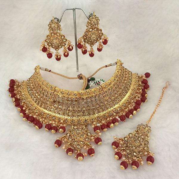 Kriaa Fine Jewelry Set-Maroon Beads Austrian Stone Choker Necklace with Maang Tikka 1113502A