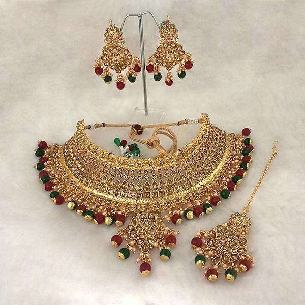ชุดเครื่องประดับ kriaa ลูกปัดสีแดงและสีเขียวสร้อยคอโชกเกอร์หินออสเตรียพร้อม Tikka-1113502B Maang