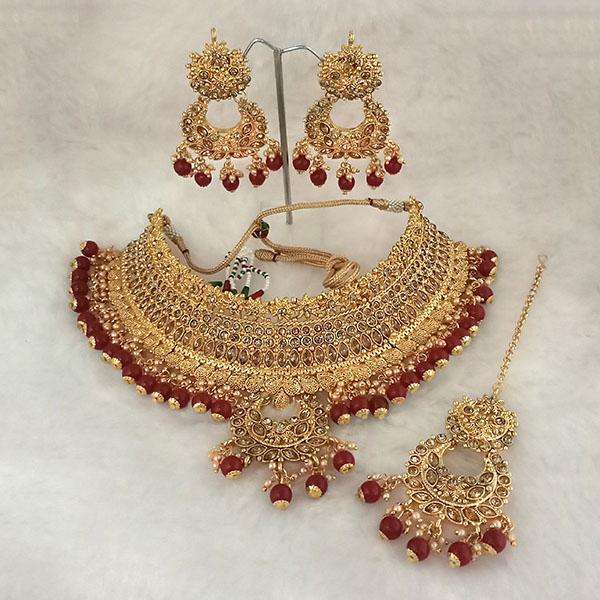 ชุดเครื่องประดับ kriaa-ลูกปัดสีน้ำตาลแดงสร้อยคอโช้คเกอร์หินออสเตรียพร้อม1113503B Maang Tikka