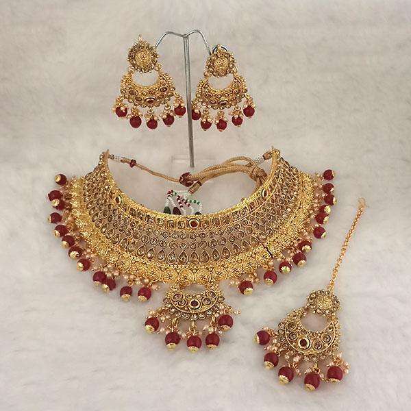 ชุดเครื่องประดับ kriaa-ลูกปัดสีน้ำตาลแดงสร้อยคอโช้คเกอร์หินออสเตรียพร้อม1113501A Maang Tikka