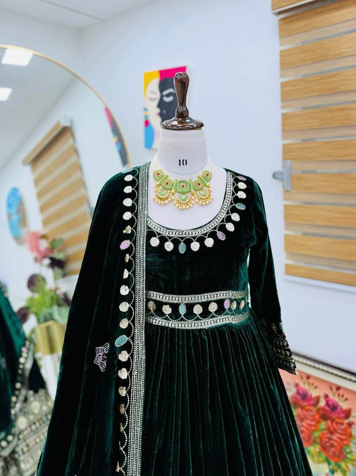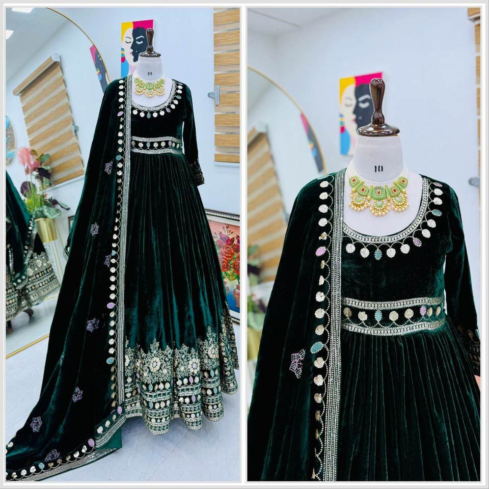 ชุดเดรสยาวแบบ Anarkali / Salwar Kameez ผ้ากำมะหยี่เนื้อหนักปักลายและประดับเลื่อม ดีไซน์แบบคริติ ซานอน ราคาขายส่ง