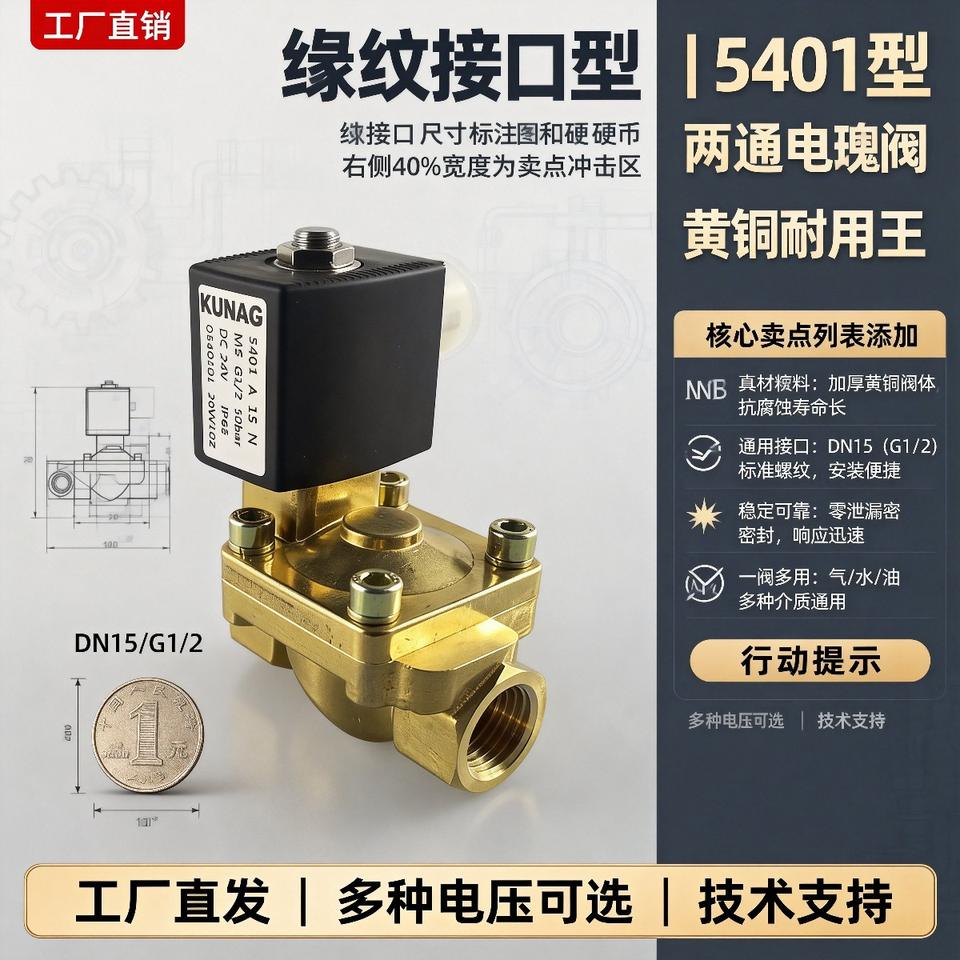 คูนัก 5401A 15 N วาล์วโซลินอยด์ทองเหลืองแบบสองทาง 1/2 นิ้ว แบบปิดปกติ สำหรับควบคุมน้ำ