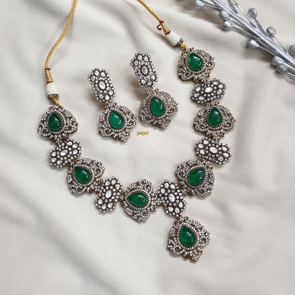 ชุดเครื่องประดับ kundan สร้อยคอและต่างหูหินคู่สีเขียวชุบทองทองแดงสำหรับเป็นของขวัญที่ประกอบด้วยเพทายไข่มุกเพชร