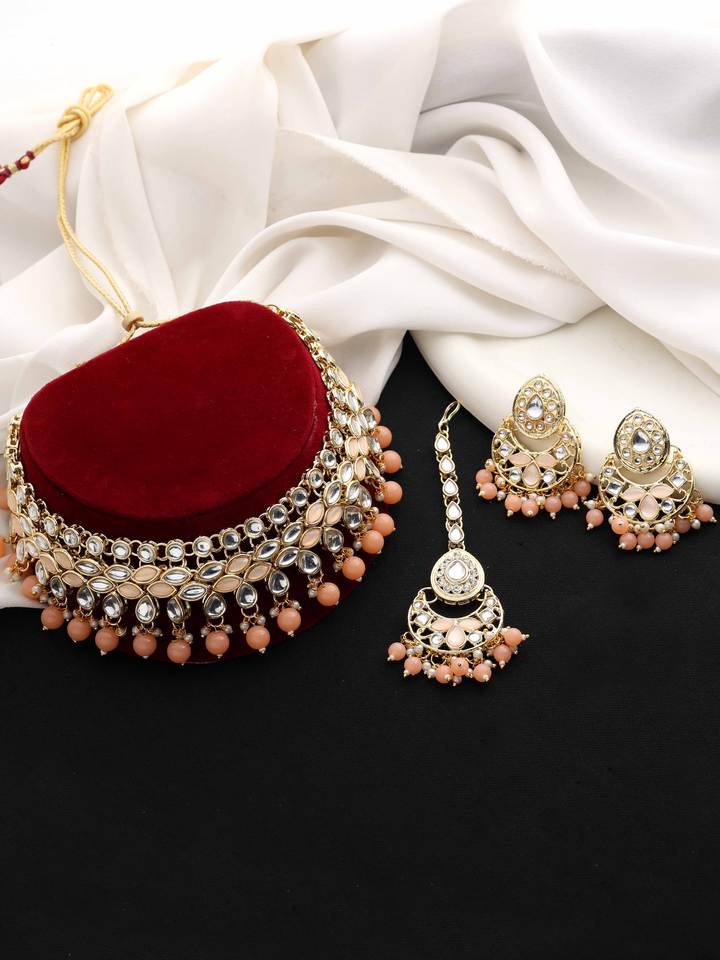 ชุดสร้อยคอแบบโชคเกอร์ดีไซน์เนอร์ชุบทองประดับด้วยหินคันดัน