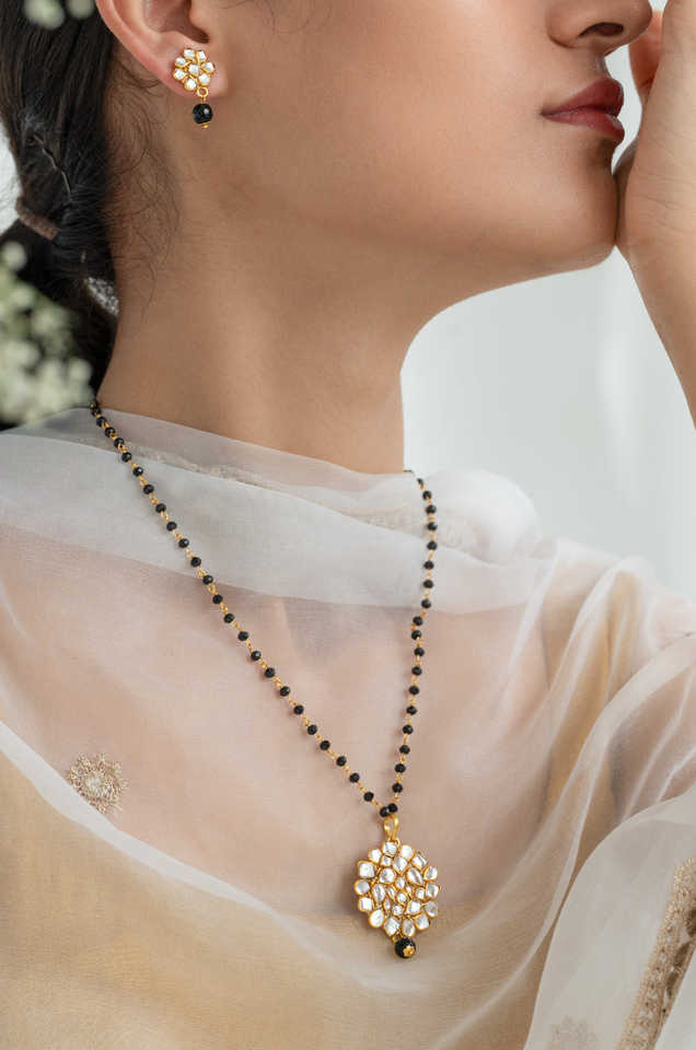 Kundan mangalsutra ลูกปัดสีดำแบบดั้งเดิมสำหรับทองเหลืองแบบดั้งเดิมที่ทันสมัยพร้อมจี้ชุบทองเครื่องประดับหินมุกสำหรับงานแต่งงาน