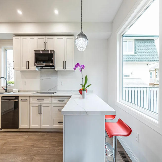 ตู้ครัวทรงตัวแอล สไตล์อเมริกันสมัยใหม่ แบบ RTA ทำจากไม้สนแท้ เคลือบเซรามิก กันน้ำ ติดตั้งง่าย