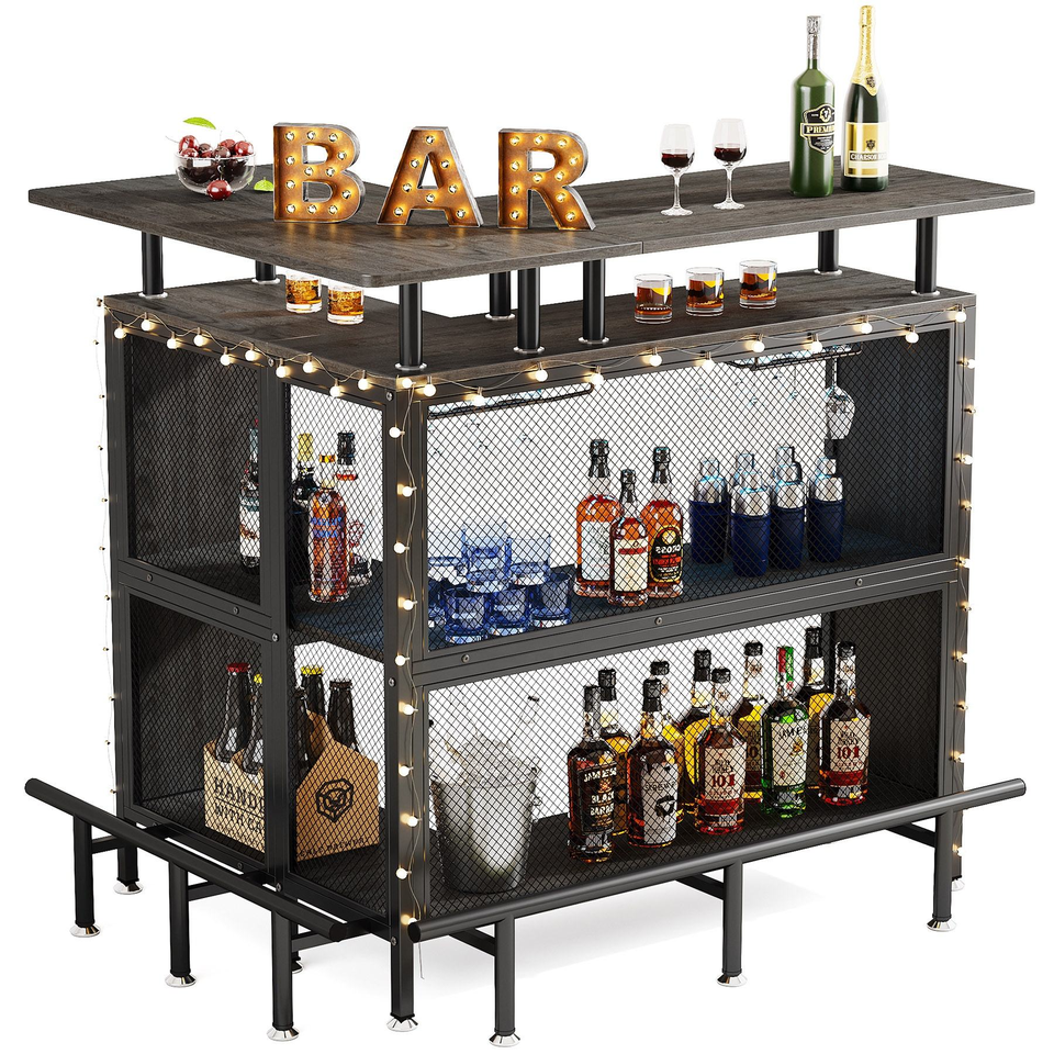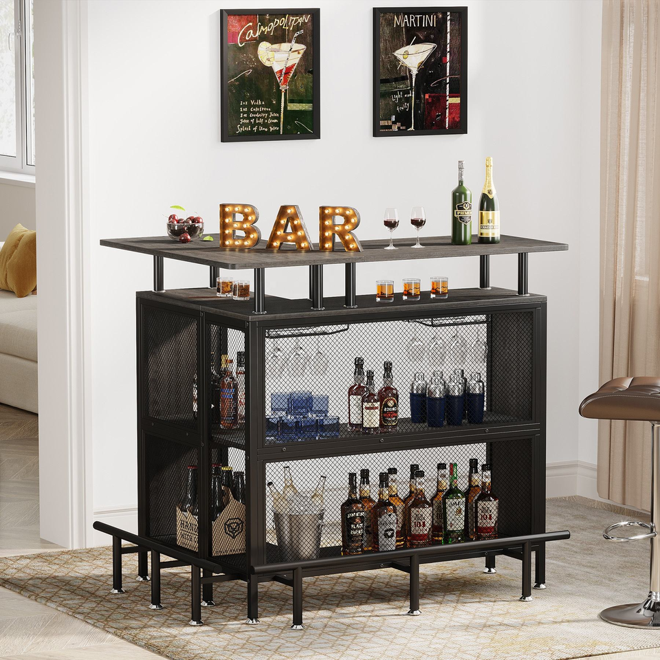 โต๊ะบาร์เหล้ารูปตัว L สำหรับใช้ในบ้าน พร้อมชั้นวางแก้วและชั้นวางของ 2 ชั้น สำหรับห้องครัว บ้าน หรือผับ