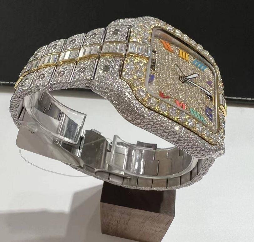 นาฬิกาเพชรสีโรสโกลด์อัตโนมัติสายสแตนเลสสองโทนเอฟเฟกต์น้ำแข็งเต็มรูปแบบหรูหราสำหรับการเคลื่อนไหวของสวิสและควอตซ์ในห้องทดลอง