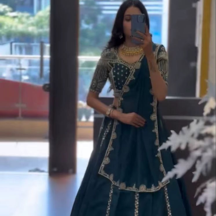 ชุดเลเฮนกาโชลีพร้อมผ้าคลุมไหล่ ผ้าไหมชิโนน ปักดิ้นลายด้วยด้ายไหม งานปักลายวินเทจ สำหรับงานปาร์ตี้ ความยาวระดับพื้น