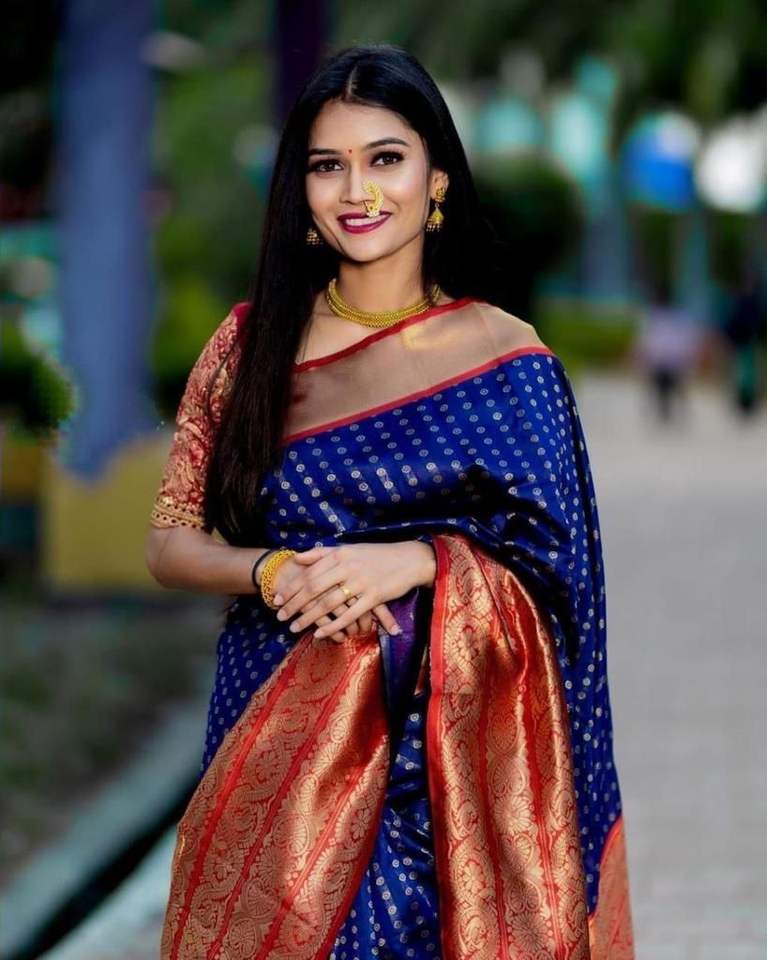 ผ้าไหมซาเร่ลายปัลลูแบบจาการ์ด งานดีไซน์สวยงาม ลวดลายหรูหราทั่วผืนบนผ้าเนื้อไหม สำหรับผู้หญิงในโอกาสพิเศษ จากกุจารัต