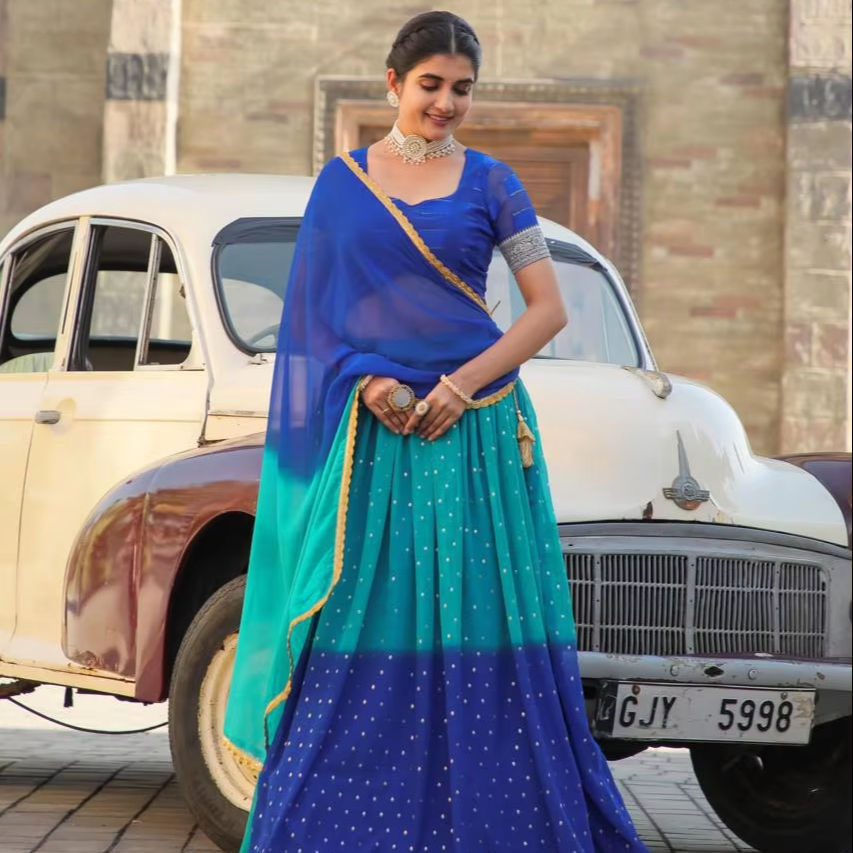 ชุดเลเฮนกาโชลีผ้าจอร์เจตเนื้อนุ่มสีฟ้าสไตล์ล่าสุด ตกแต่งด้วยงานฟอยล์อย่างประณีต ความยาวระดับพื้น ทรงปกติ เหมาะสำหรับทุกฤดูกาล พร้อมผ้าคลุมไหล่