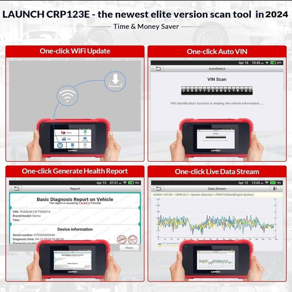 เครื่องสแกน OBD2 รุ่น LAUNCH CRP123E พร้อมระบบวินิจฉัย 4 ระบบ และบริการรีเซ็ต 3 รายการ รองรับการสแกน VIN อัตโนมัติ พร้อมอัปเดตฟรีตลอดอายุการใช้งาน