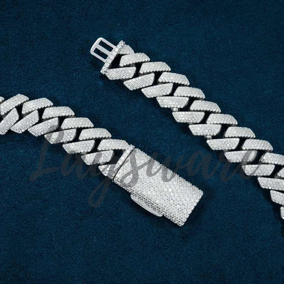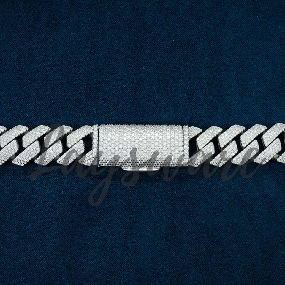 สร้อยคอ LAYSWARE JEWELS แบบ Cuban Link ขนาด 14 มม. ประดับเพชร Moissanite เกรด VVS วัสดุเงินแท้ 925 รับรองโดย IGI เหมาะสำหรับทั้งชายและหญิง สไตล์ฮิปฮอป ดีไซน์แบบเสื้อสเวตเตอร์ วิบวับสวยงาม