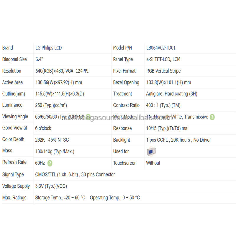 ผู้จัดจำหน่ายหน้าจอ LCD รุ่น LB064V02-TD01 หน้าจอขนาด 6.4 นิ้ว ความละเอียด 640*480 จอแสดงผล LCD รุ่น LB064V02-TD01 แผงจอ LCD