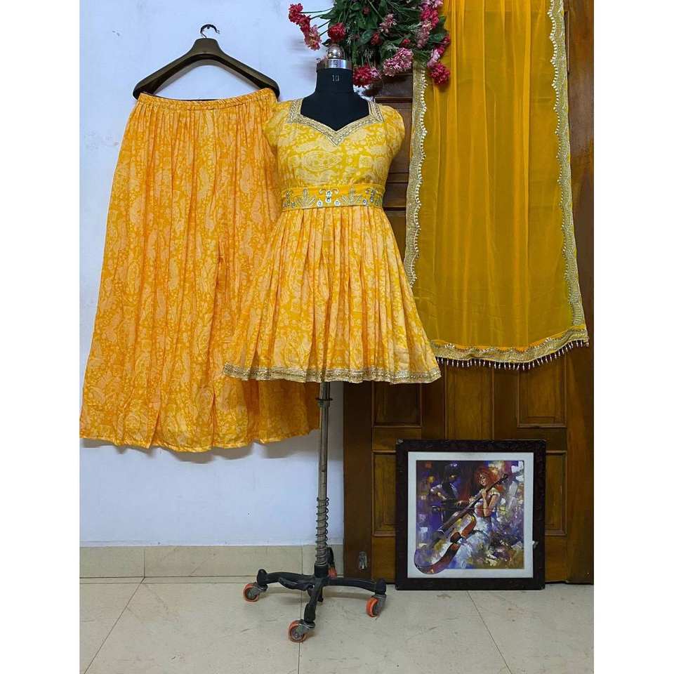 ชุดเสื้อและกางเกงสีเหลืองสำหรับผู้หญิง พร้อมผ้าคลุมไหล่ 850 กรัม ฟรีไซส์ สำหรับงานปาร์ตี้