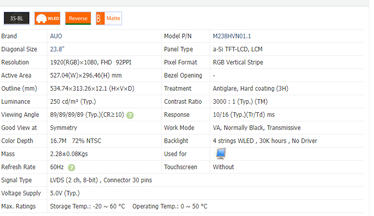 หมายเลขรุ่น:M238HVN02.1 M238HVN01.1