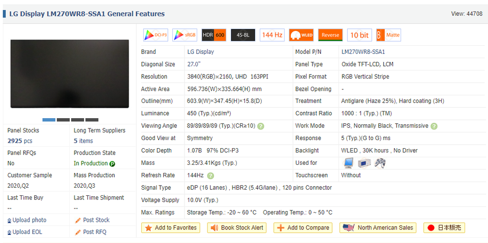 LCDOLED Original New 27 Inch LCD Screen LM270WR8 (SS)(A1) LM270WR8 LM270WR8-SSA1 LM270WR8 SS A1 4K 144HZ for Monitor LG 27GN950