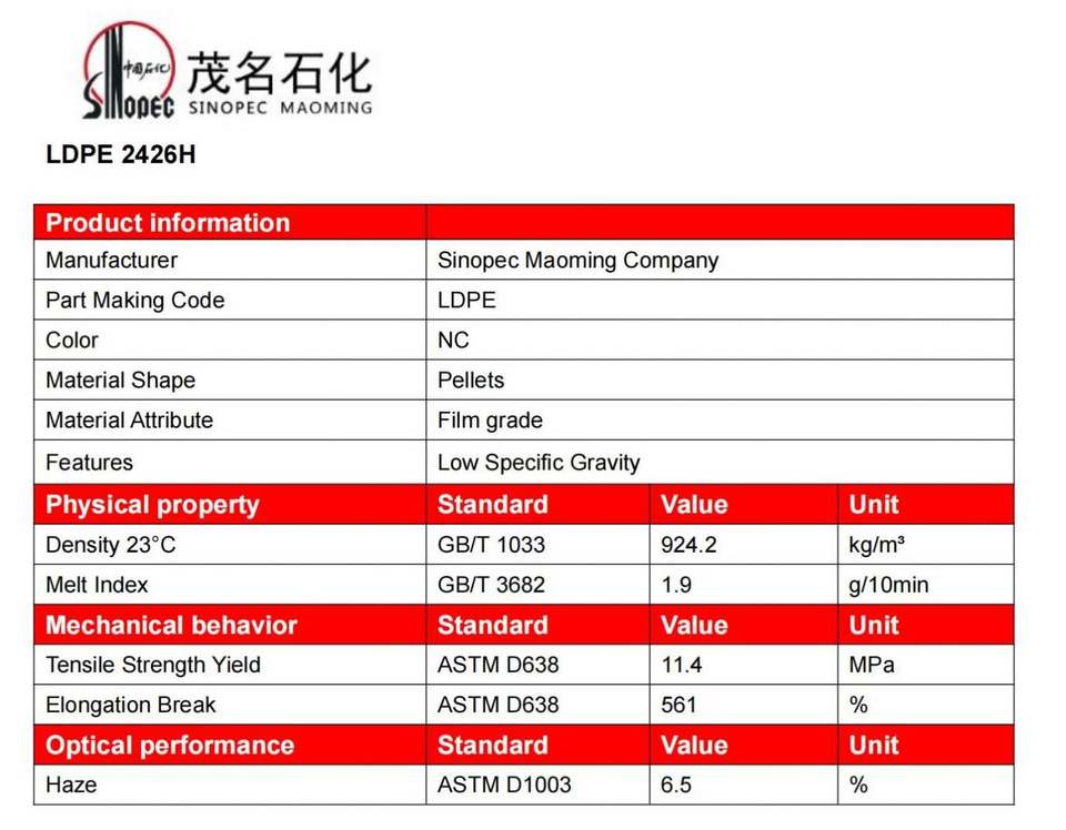 เม็ดพลาสติกความหนาแน่นต่ำ Sinopec LDPE 2426H เกรดฟิล์ม