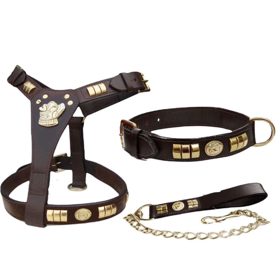 สายรัดสุนัขดีไซน์เนอร์หนังคอปกชุดรวมสายจูงพร้อมข้อต่อทองเหลืองทั้งหมด