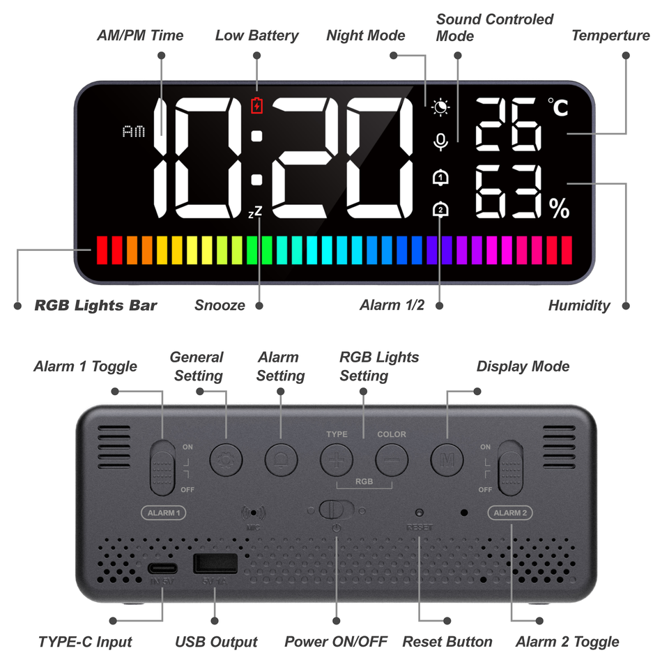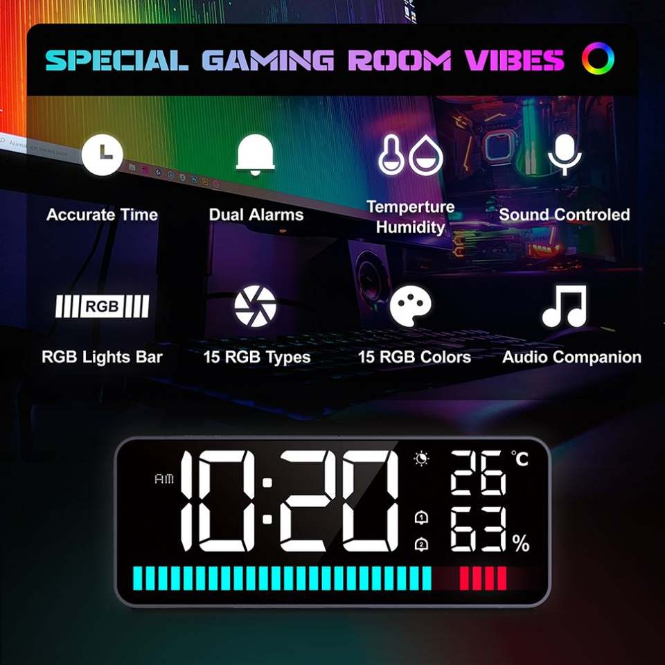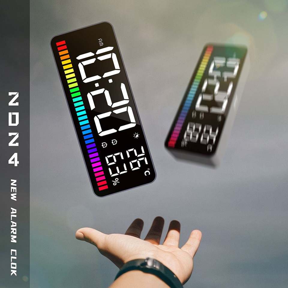 นาฬิกา LED พร้อมแถบแสดงจังหวะ นาฬิกาปลุกแบบตั้งโต๊ะ วัดอุณหภูมิและความชื้นแบบดิจิตอล พร้อมฟังก์ชั่นเลื่อนปลุก และหน้าจอแบบกระจก