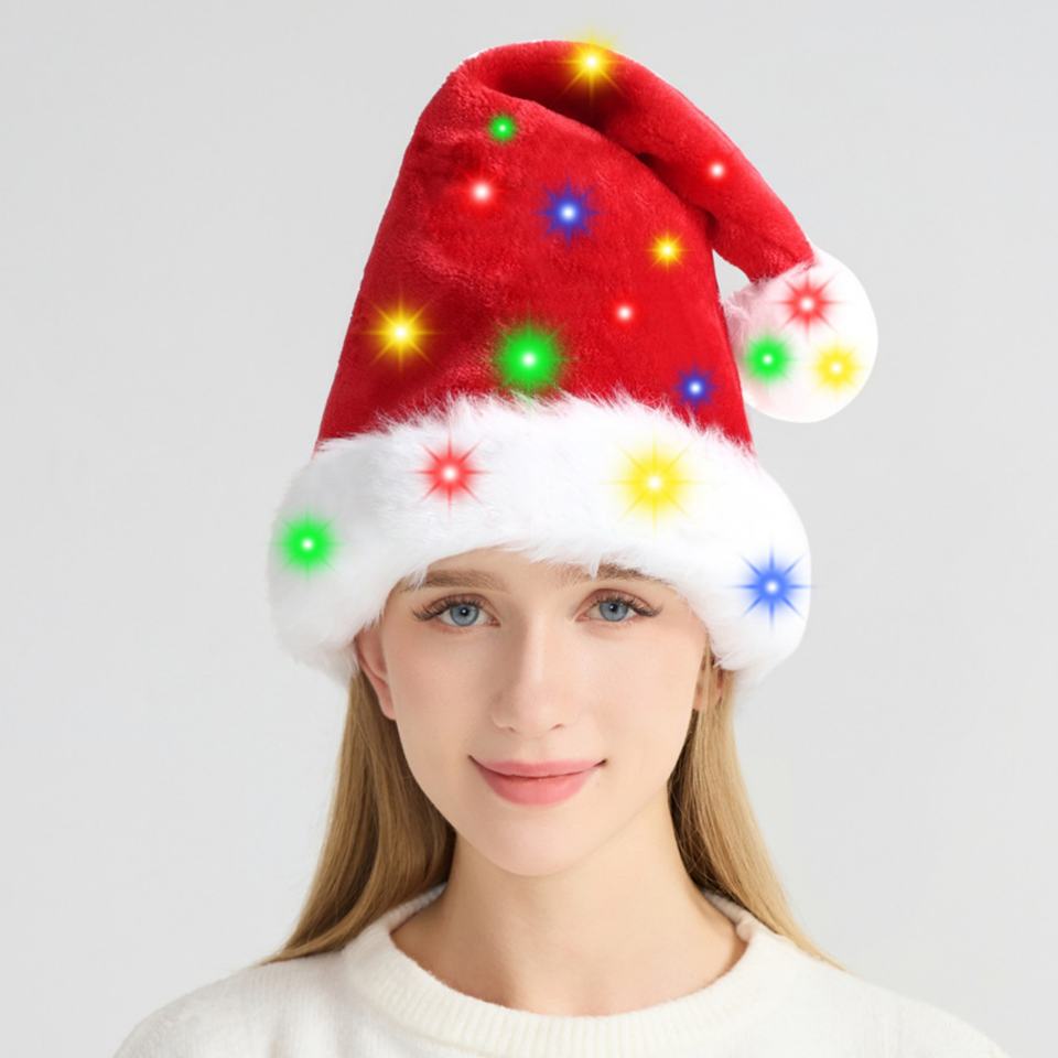 หมวกคริสต์มาสไฟ LED หมวกขนยาวเต็มใบพร้อมการตกแต่งเรืองแสงสำหรับผู้ใหญ่และเด็กสวมใส่ในเทศกาล
