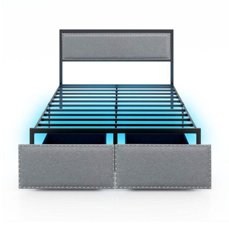 เตียงพร้อมไฟ LED ในลิ้นชักและโครงเตียงโลหะแบบมีแผ่นไม้ระแนง ขนาด Full/Queen/Twin หุ้มด้วยผ้า