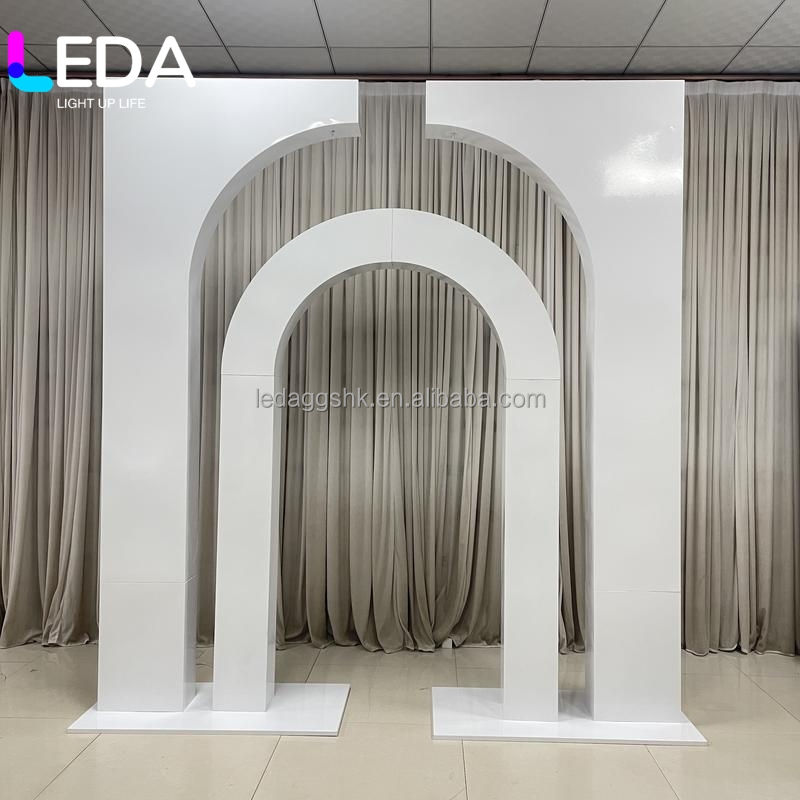 ซุ้มแต่งงานโลหะสีขาวแบบกำหนดเอง LEDA พร้อมขาตั้งโคมระย้า ฉากหลังงานแต่งงานสุดหรู สำหรับตกแต่งเวทีงานอีเว้นท์และปาร์ตี้