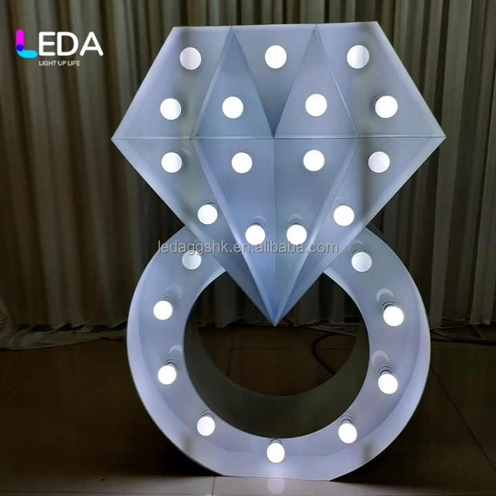 ตัวอักษร LED โลหะแบบกำหนดขนาดเองของ LEDA ฉากหลัง 3 มิติ พร้อมขาตั้ง วงแหวนเพชร ดีไซน์ทันสมัย สำหรับงานแต่งงาน โฆษณา ตกแต่ง ขอแต่งงาน