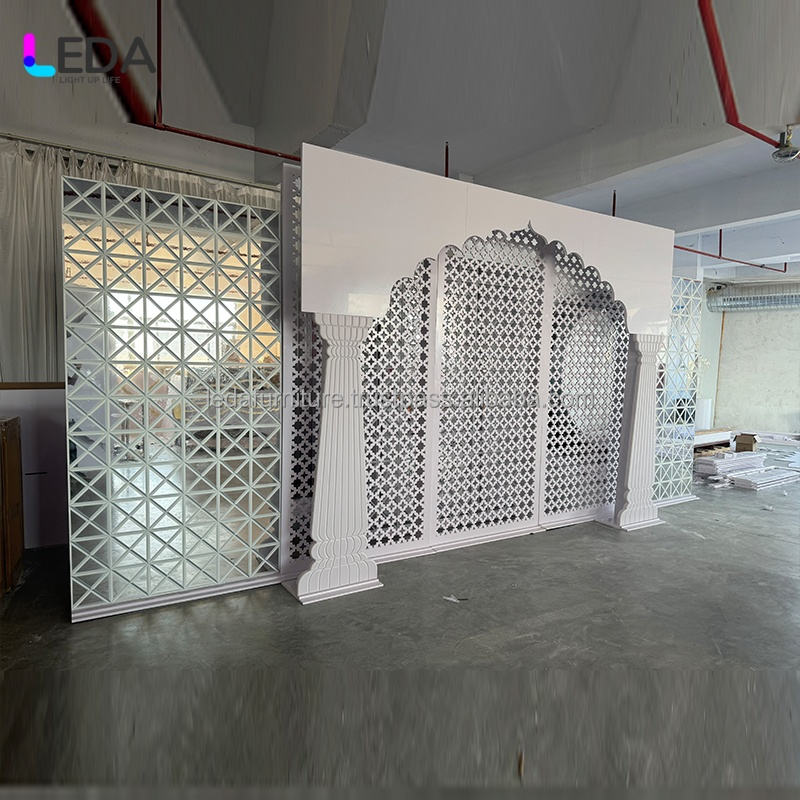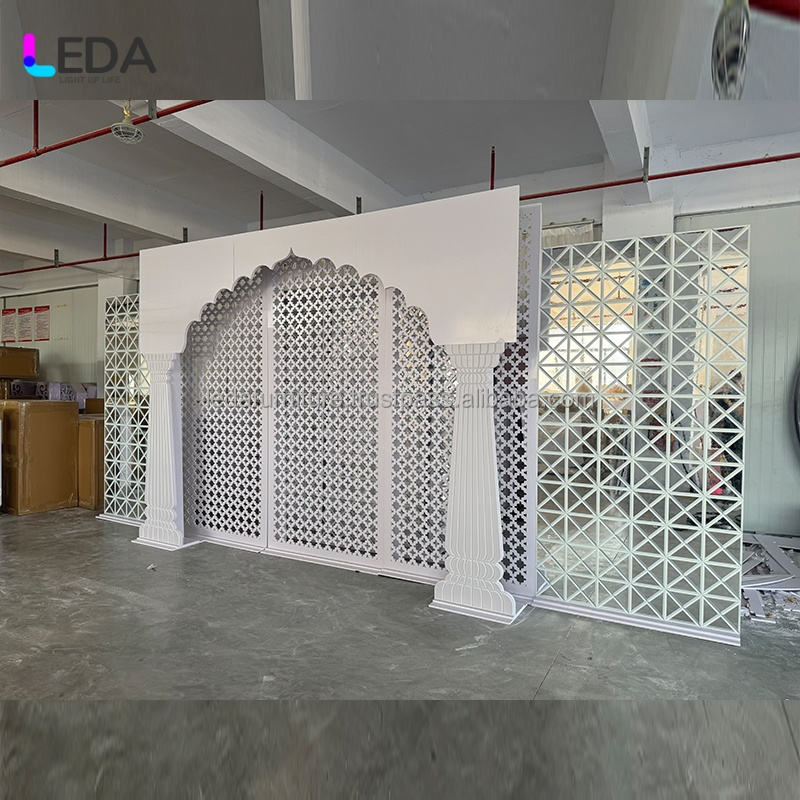 Leda การตัดด้วยเลเซอร์สีขาวหรูหราสำหรับงานแต่งงานรูปแบบโค้งที่ซับซ้อนฉากหลังขนาดใหญ่สำหรับงานเลี้ยงงานแต่งงาน