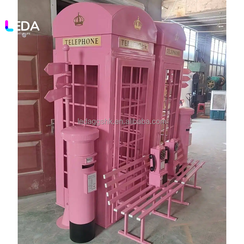 บูธโทรศัพท์สีขาวคลาสสิกสไตล์ลอนดอนสำหรับงานแต่งงาน ลดราคาพิเศษ ตกแต่งงานปาร์ตี้ ฉากถ่ายรูป บูธโทรศัพท์โลหะสีชมพู