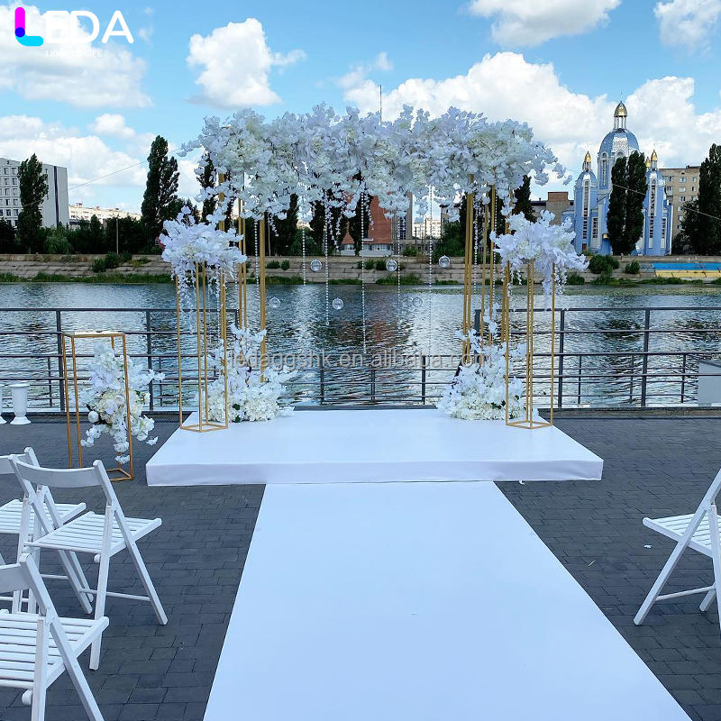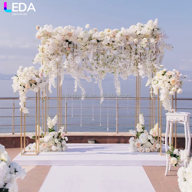 เวทีงานแต่งงานสุดหรู LEDA ซุ้มโค้งสีทองตกแต่งด้วยดอกไม้ ฉากหลังโลหะทรงสี่เหลี่ยมสำหรับงานแต่งงานและงานอีเว้นท์