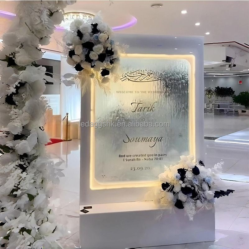 ฉากหลังงานแต่งงานดีไซน์ใหม่ของ LEDA ตกแต่งด้วยน้ำตกแก้วใส โครงอะลูมิเนียมอัลลอยด์ ป้ายต้อนรับสีขาว ของตกแต่งงานแต่งงาน
