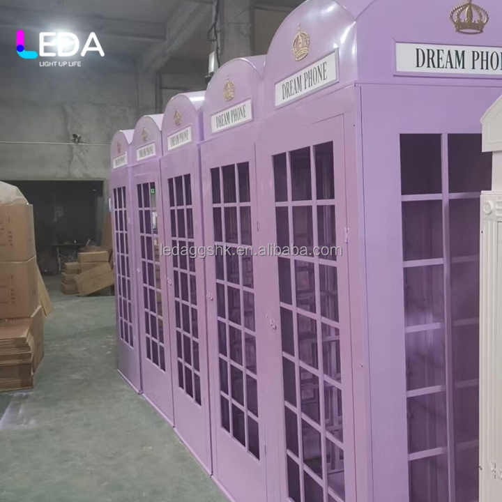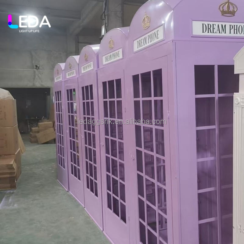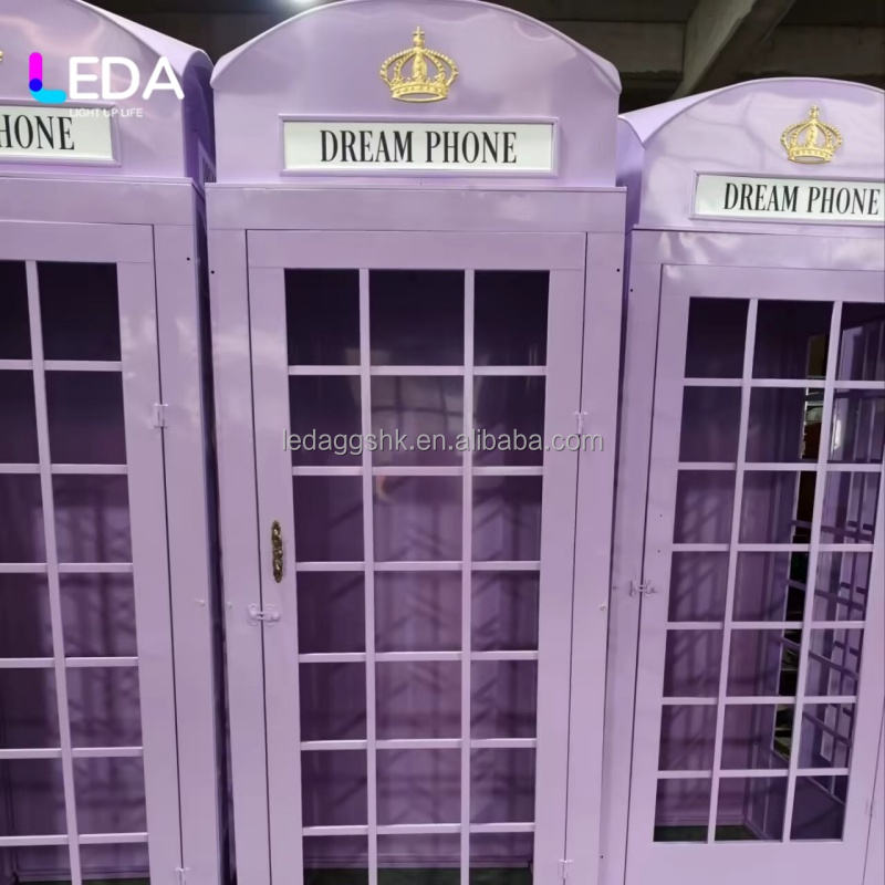 ตู้โทรศัพท์สีม่วงตกแต่งภายนอกอาคาร LEDA งานฝีมือโลหะ ฉากหลังงานแต่งงาน แท่นบันทึกเสียงแขกสำหรับงานอีเว้นท์