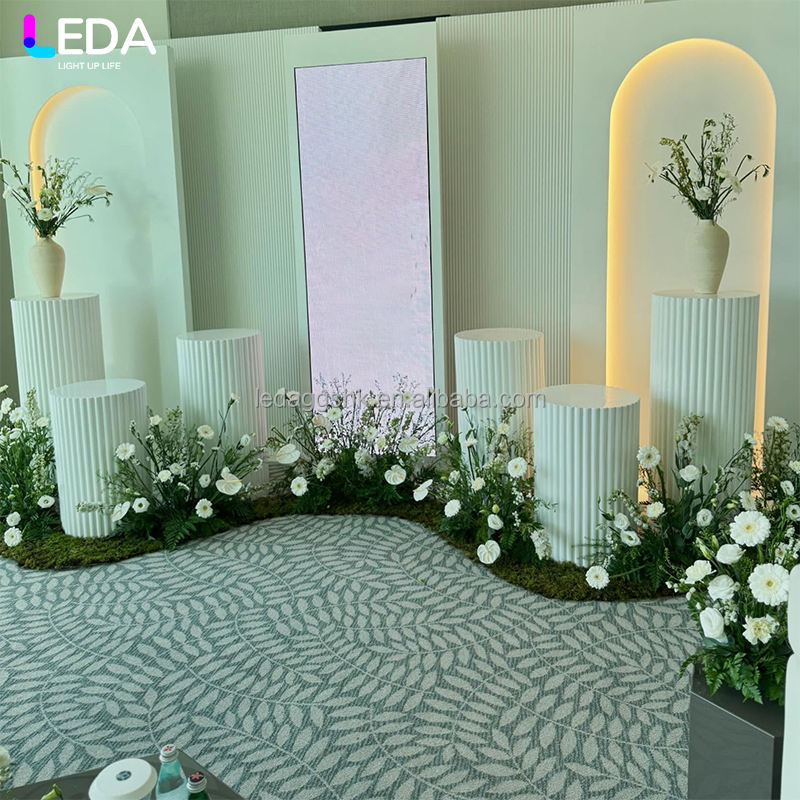 ฉากหลังงานแต่งงานอะคริลิคทรงสี่เหลี่ยมโค้งสีขาวแบบสามชิ้นพร้อมจอแสดงผล LEDA