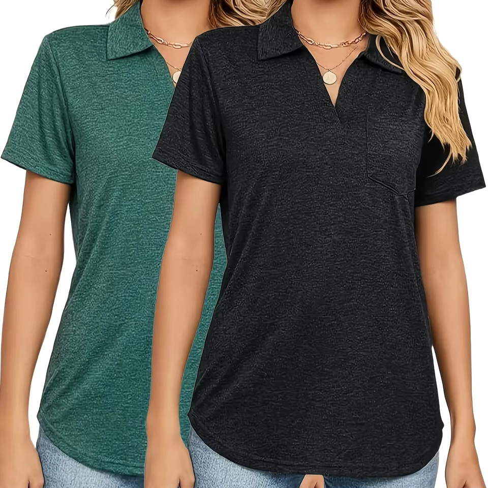 เสื้อคอวีแขนสั้นลำลองสำหรับผู้หญิง2ชิ้น-ผ้าสแปนเด็กซ์/ ผ้าฝ้ายระบายอากาศได้ดีแห้งเร็วกำหนดสีได้
