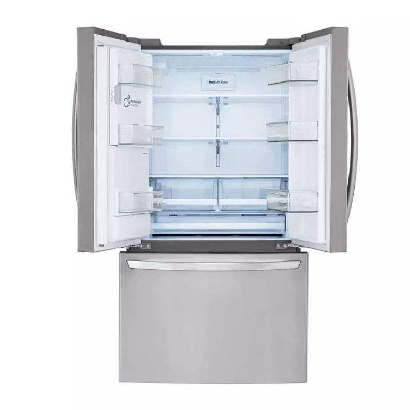 ตู้เย็นแอลจี 28 คิว 3 ประตูแบบเฟรนช์ดอร์ ความลึกมาตรฐาน พร้อมเครื่องทำน้ำแข็งและน้ำเย็นแบบกด ตู้ทำน้ำแข็งสูง วัสดุสแตนเลส