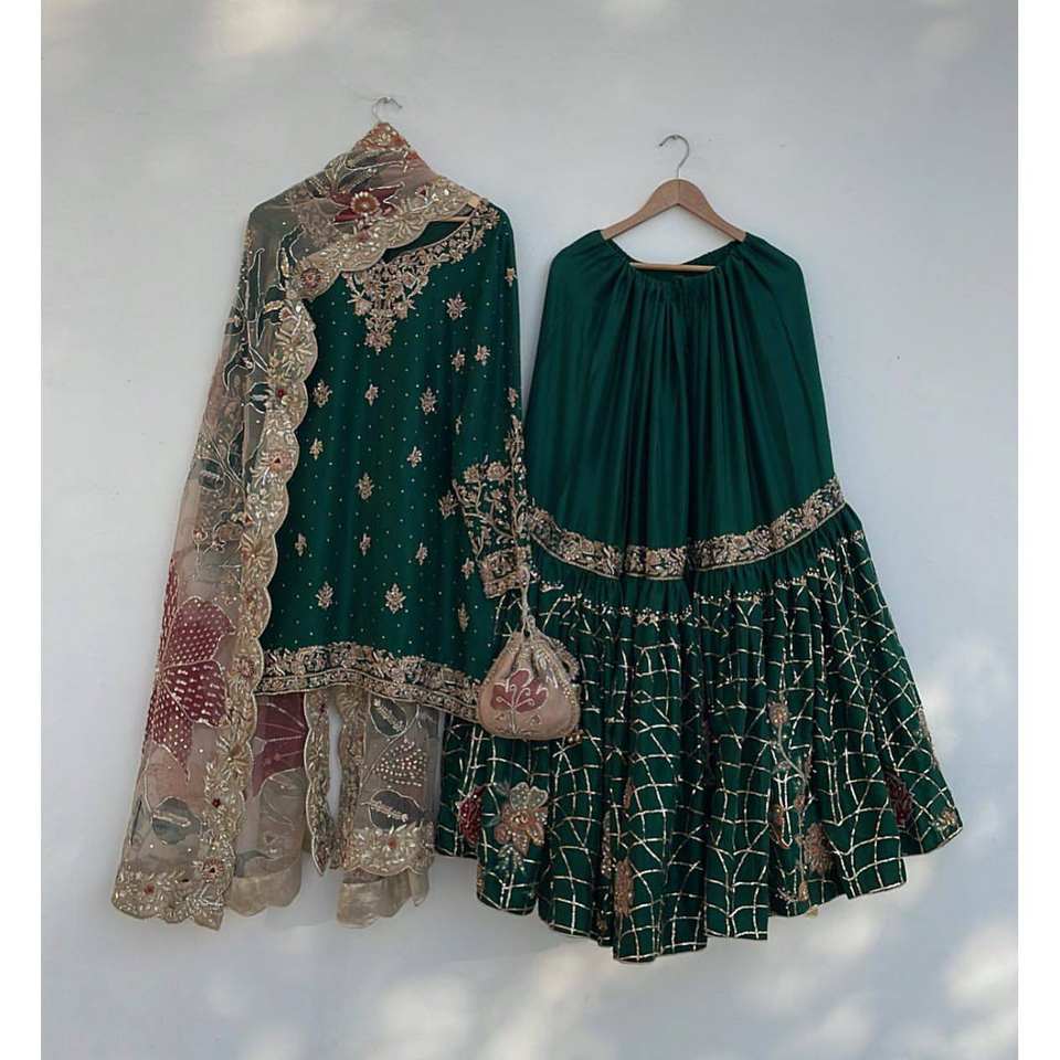 ชุดเสื้อผ้าดีไซน์เนอร์ LG สไตล์อินเดียและปากีสถาน สำหรับงานปาร์ตี้ สีเขียว ไซส์ M เสื้อและกางเกงพร้อมผ้าคลุมไหล่แฟนซี