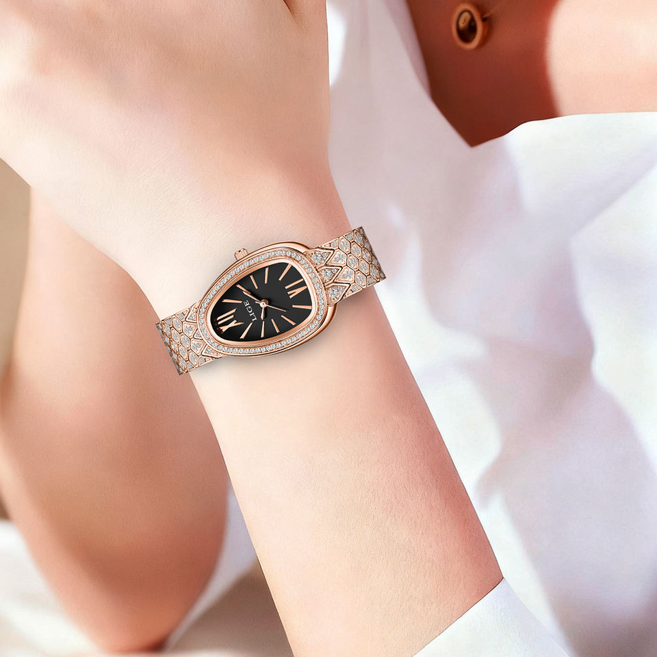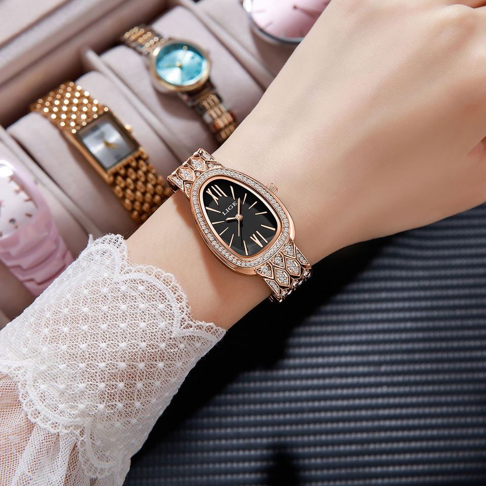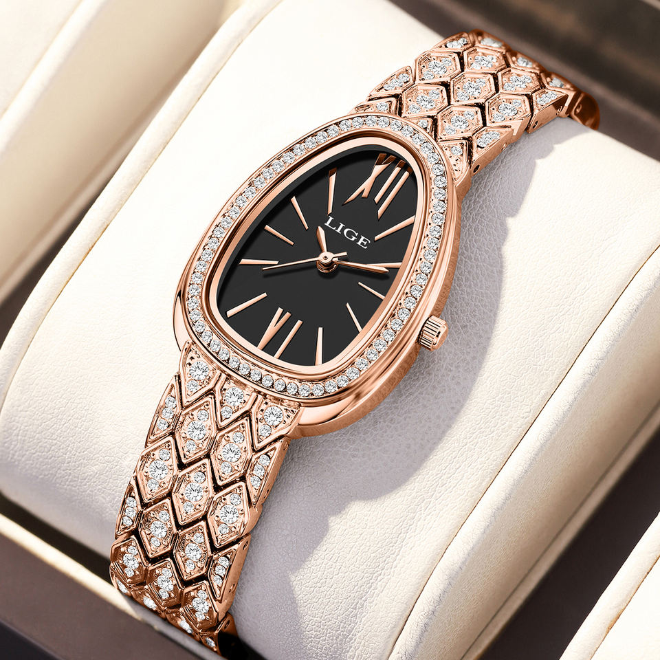 นาฬิกาควอตซ์ประดับเพชรสีโรสโกลด์รูปวงรี LG89275 Lige สำหรับผู้หญิงนาฬิกาตัวเลขโรมันแนววินเทจสำหรับผู้หญิง
