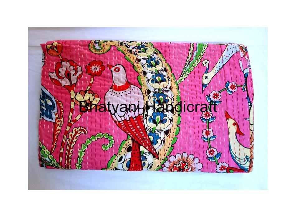 LIGHT PINK Big Bird Kantha Quilt Cotton Kantha Blanket Bohemian Bedspread Home Decor Reversible Quilt Sofa Coverlet