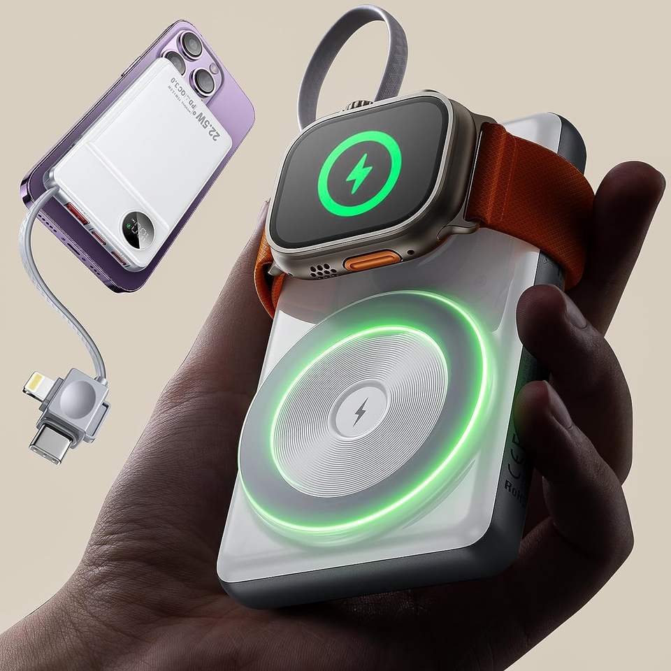 Lisen 5 in 1ก้อนแบตเตอรี่แม่เหล็ก10000มิลลิแอมป์ต่อชั่วโมงแบบพกพาไร้สายแบตเตอรี่สำรองสำหรับ iPhone 16 15 14 PRO MAX นาฬิกาอัจฉริยะสำนักงาน