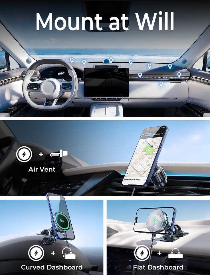 ปรับได้, ชาร์จในรถยนต์, วัสดุยืดหยุ่น, แม่เหล็ก, ไร้สาย
