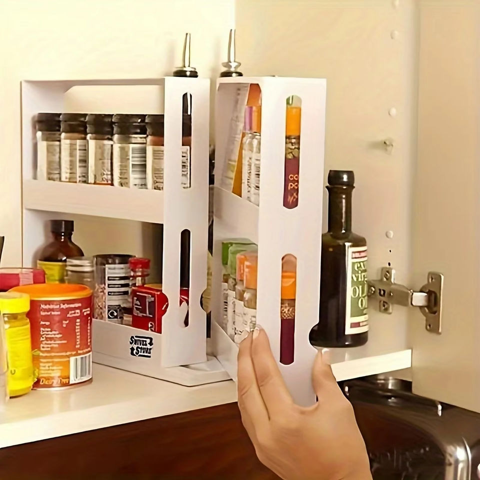 ตู้เก็บของในครัวแบบเลื่อน 2 ชั้น LM LM25079 วัสดุพลาสติก ชั้นวางหมุนได้สำหรับจัดระเบียบขวดเครื่องเทศและขวดต่างๆ