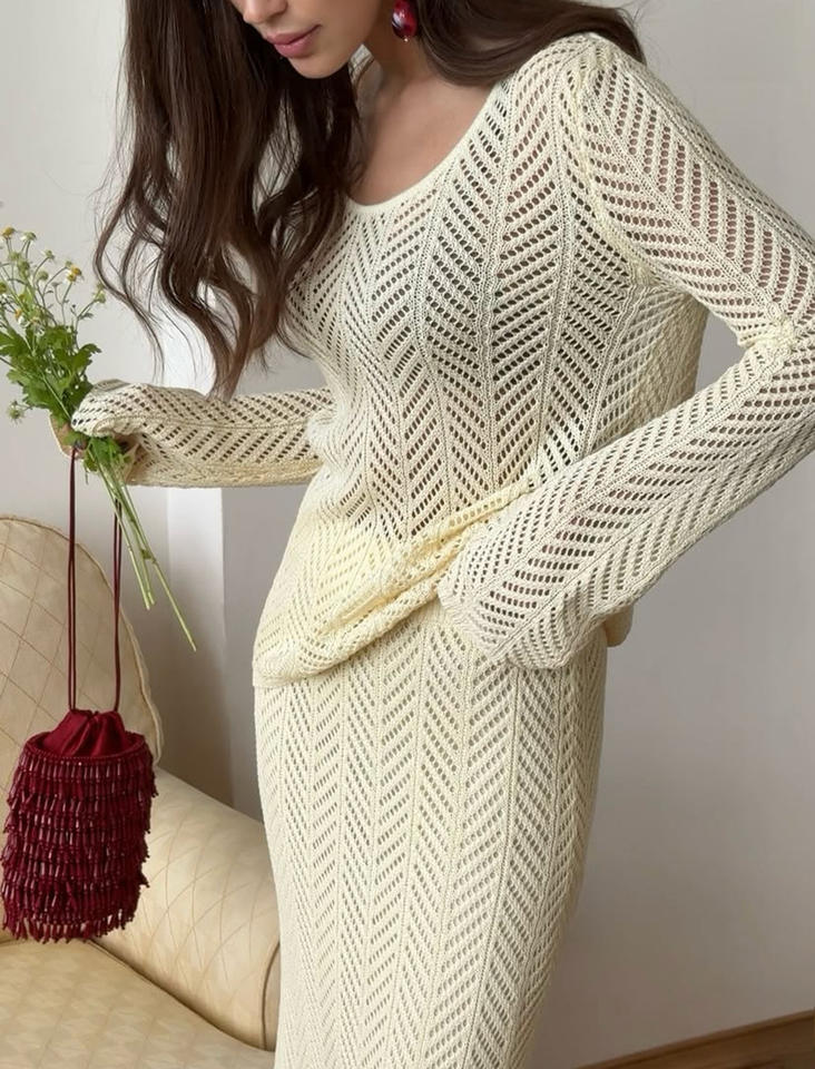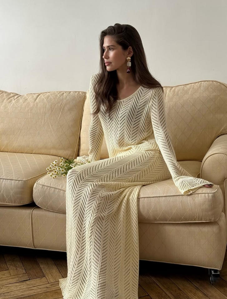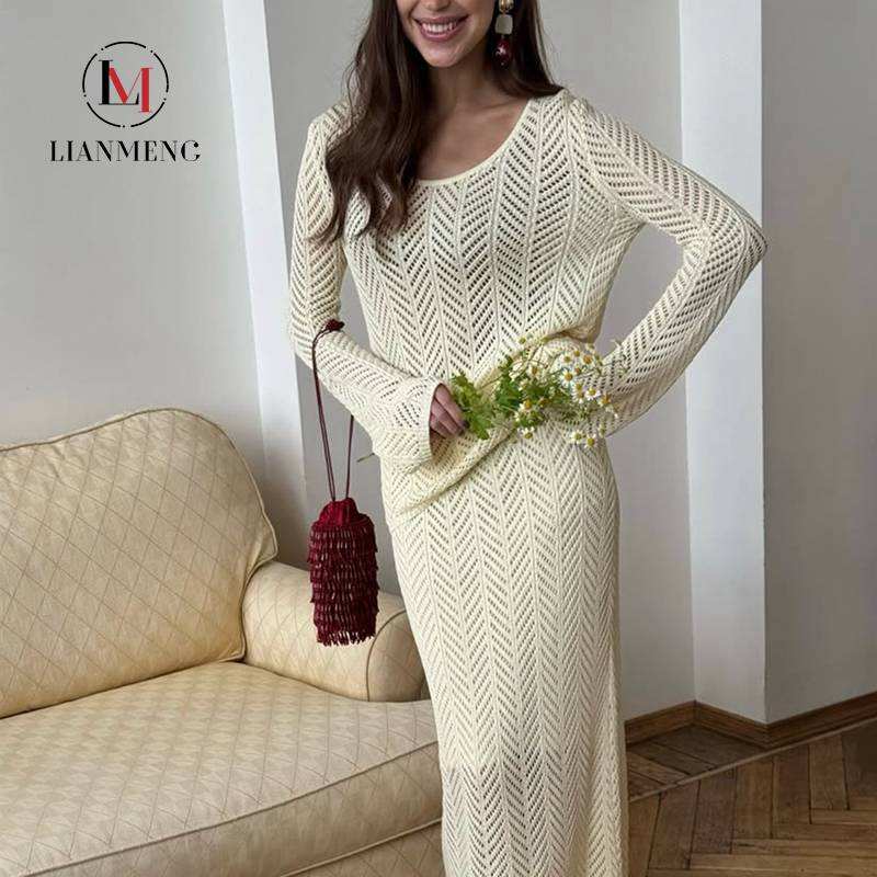 เดรสยาวถักโครเชต์ทรงวี รุ่น LM S11 สีขาว ดีไซน์หรูหรา แขนยาว ลายฉลุ