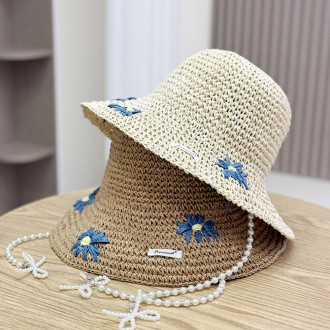 LND Pearl Blue Flower Rattan Hat Women's Summer Sun Cap for Resort Safari Jungle Bucket Straw Design