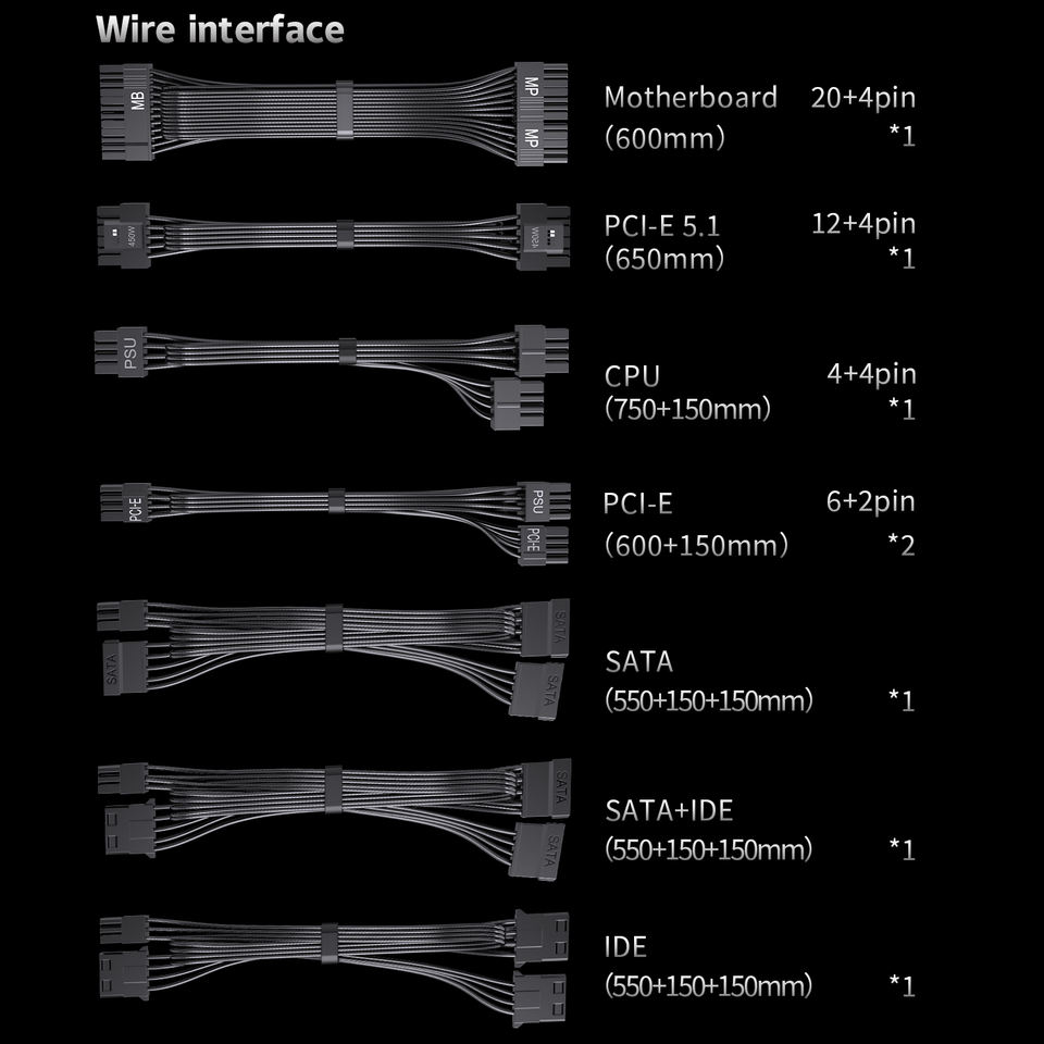 ความยาวของสายเคเบิล (จาก PCB)::20+4P 520MM/P8(P4+P4) 520MM/PCI-E6+2500MM/SATA+SATA+L*2 400มม.