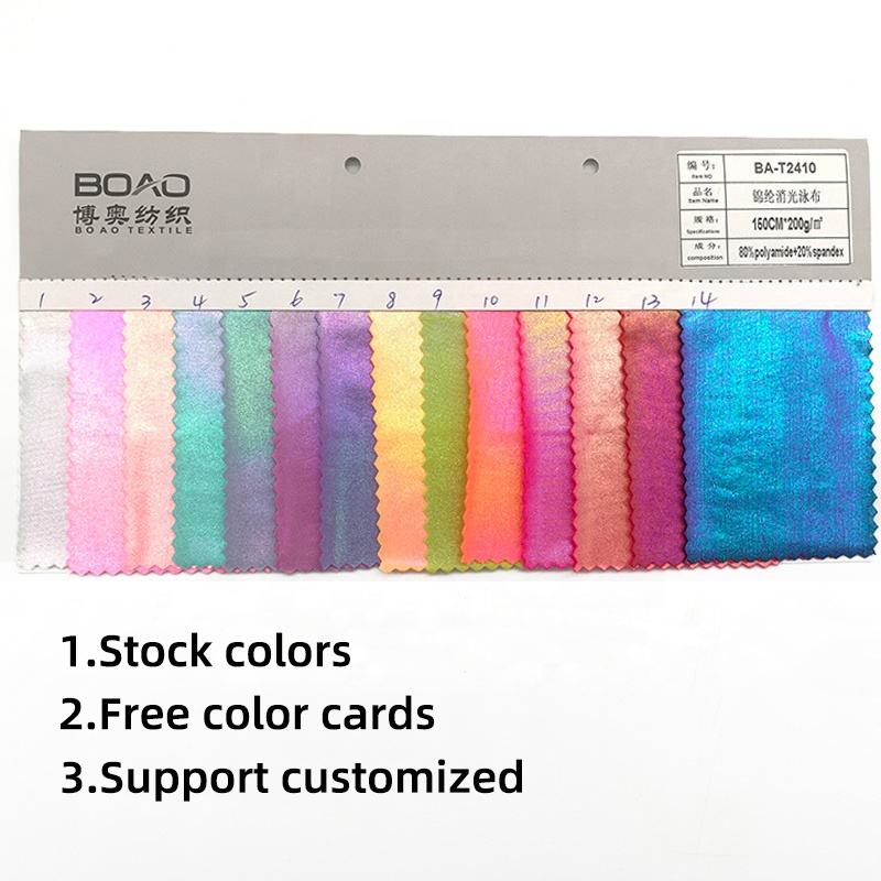 ผ้าโพลีเอไมด์ผสมสแปนเด็กซ์พิมพ์ลายโฮโลแกรมเมทัลลิกกลิตเตอร์นีออนแบบมิสติกฟอยล์ สำหรับชุดว่ายน้ำ ชุดชายหาด และชุดเดรสสำหรับการแสดง ขั้นต่ำในการสั่งซื้อน้อย
