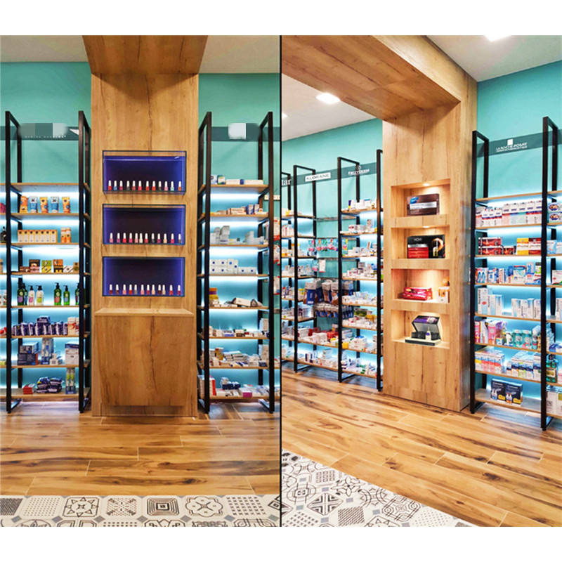 ชั้นวางของสำหรับจัดแสดงเฟอร์นิเจอร์สำหรับร้านค้าปลีกร้านขายยาออกแบบภายในร้านขายสินค้าผลิตตามสั่ง